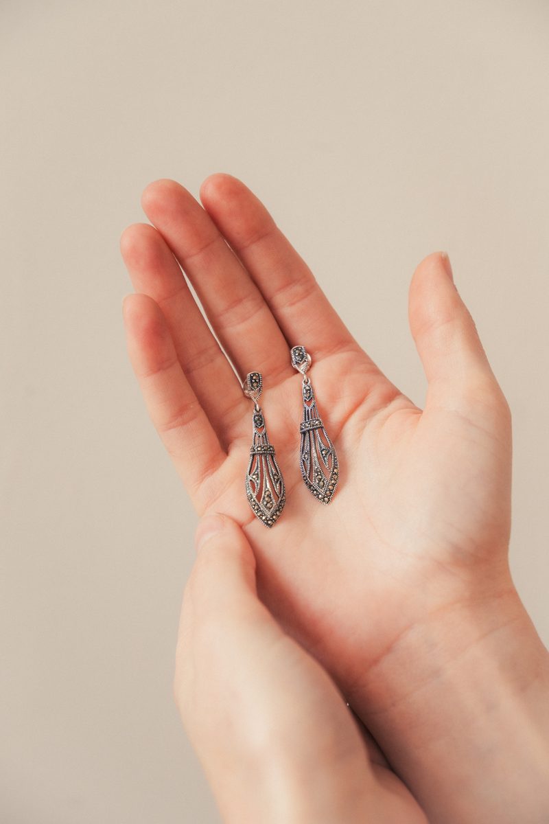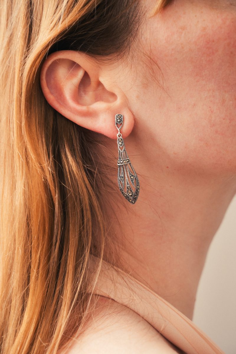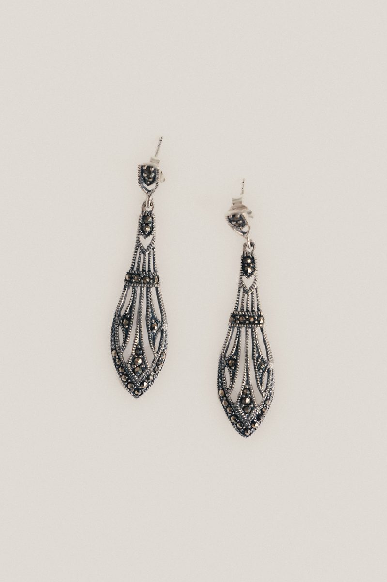Sterling silver dangle earrings with marcasite stones. Elongated teardrop shape with an openwork structure featuring Art Deco geometry and a push-back closure. A jewel with understated presence and distinctive style, selected by L’Arca Barcelona.