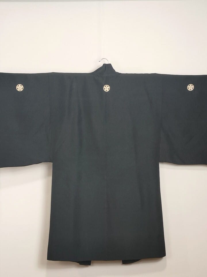 Black vintage Haori made of natural silk with the family emblem “kamon” on the back.