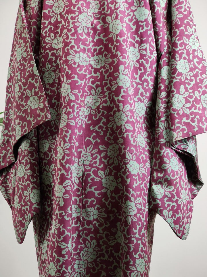 Vintage purple silk haori with colorful aqua green vegetable print.