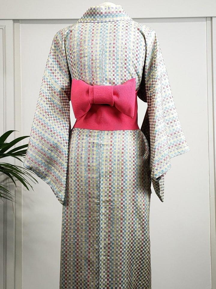 Authentic vintage kimono with multicolor geometric print. Lightweight unlined women’s kimono, used during the hottest months of the year.