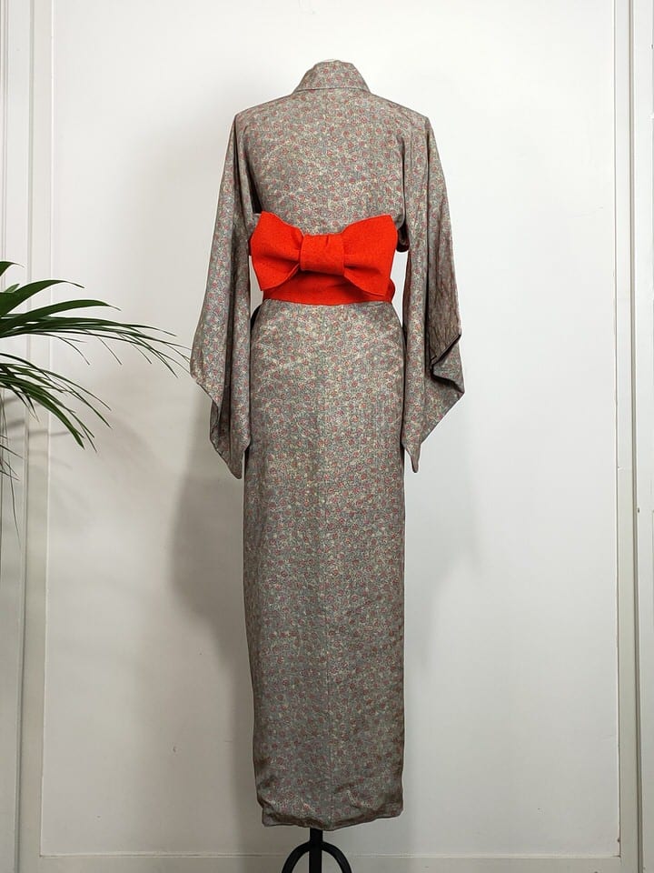 Wonderful vintage kimono gray background printed with floral motifs in red and yellow tones. With two-tone natural silk lining.