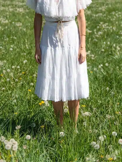 Bohemian style skirt in cotton batiste with fine antique embroidery. The elastic waistband allows to adapt the piece to various sizes. It is fastened at the back with a small invisible zipper.
