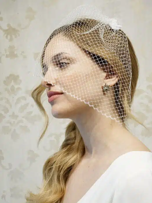 Elegant bridal headdress with white velvet bow, comb and white net for bride, hand assembled. Bridal headdress with vintage bow and hairnet on comb. Vintage style bridal headpiece with white tulle veil cage and velvet bow with rhinestones. Ideal bridal headpiece for a romantic look.