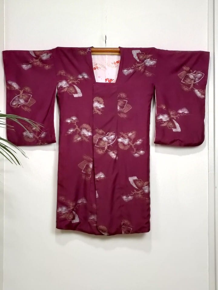 Vintage Michiyuki in deep fuchsia color with delicate fan patterns. The inner lining is decorated with branches and almond blossoms.