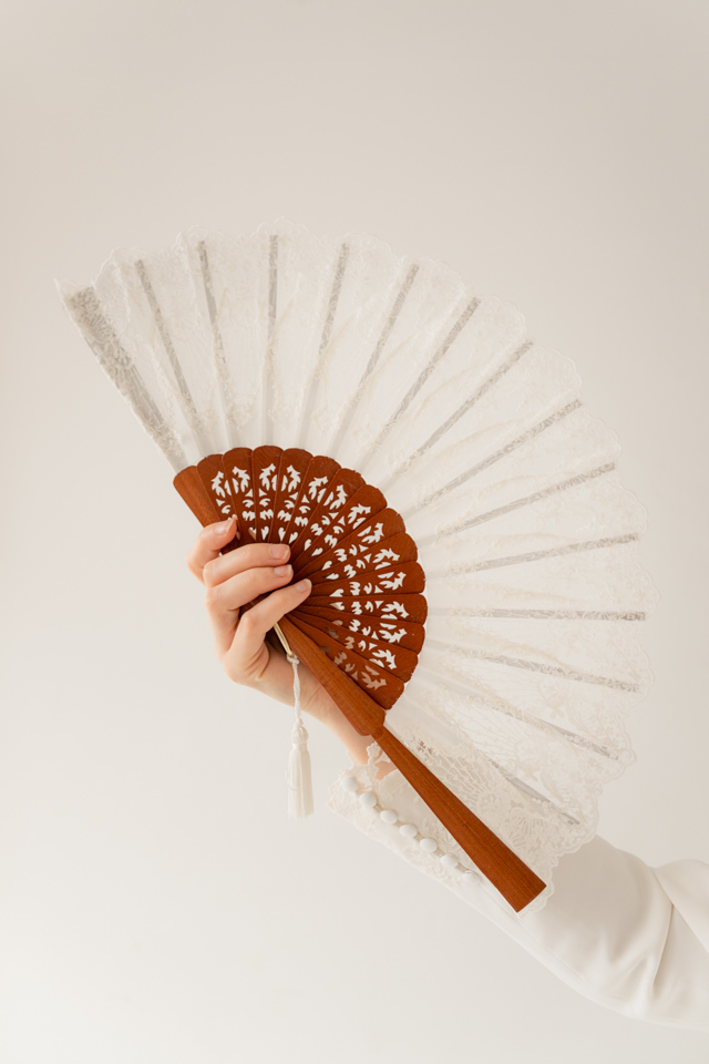 Este abanico de novia combina la calidez de la madera natural con la ligereza del encaje tipo tul bordado, creando una pieza delicada y funcional que añade un toque de distinción al estilismo nupcial. Hecho a mano en España, este abanico está pensado para acompañar a la novia desde los preparativos hasta el altar, aportando frescura y belleza en cada movimiento.