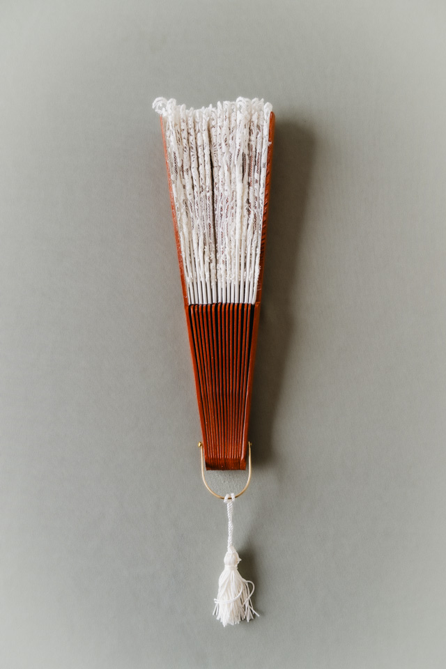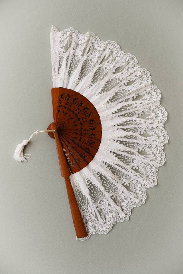 Abanico de novia en madera natural con encaje tipo tul bordado. Un accesorio clásico y refinado para complementar tu look nupcial con elegancia.