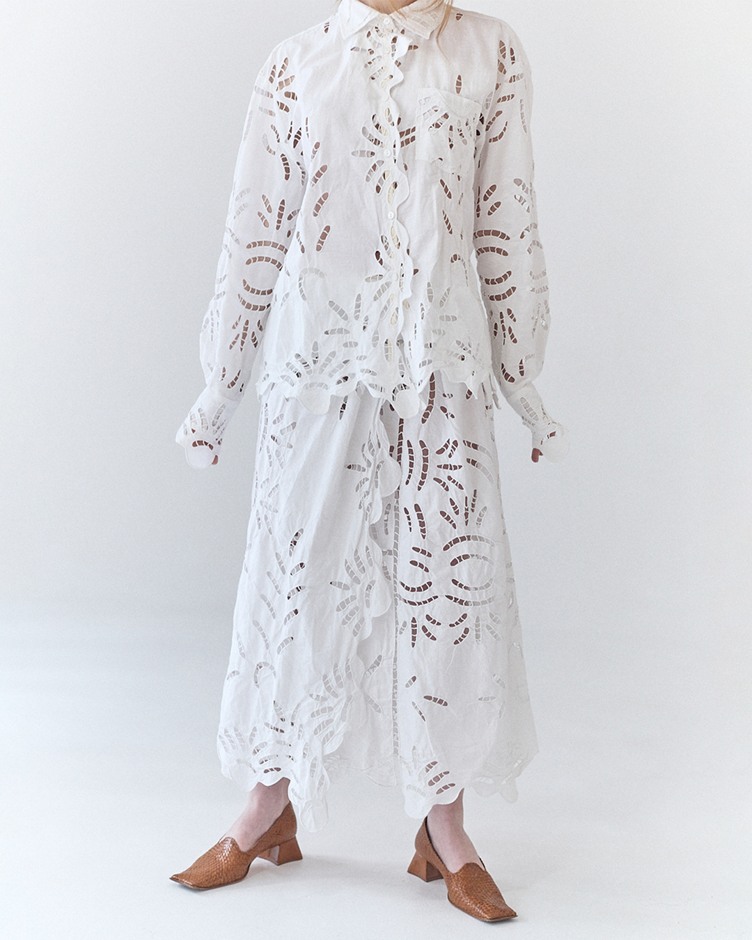 Falda blanca calada con encaje Richelieu hecho a mano.