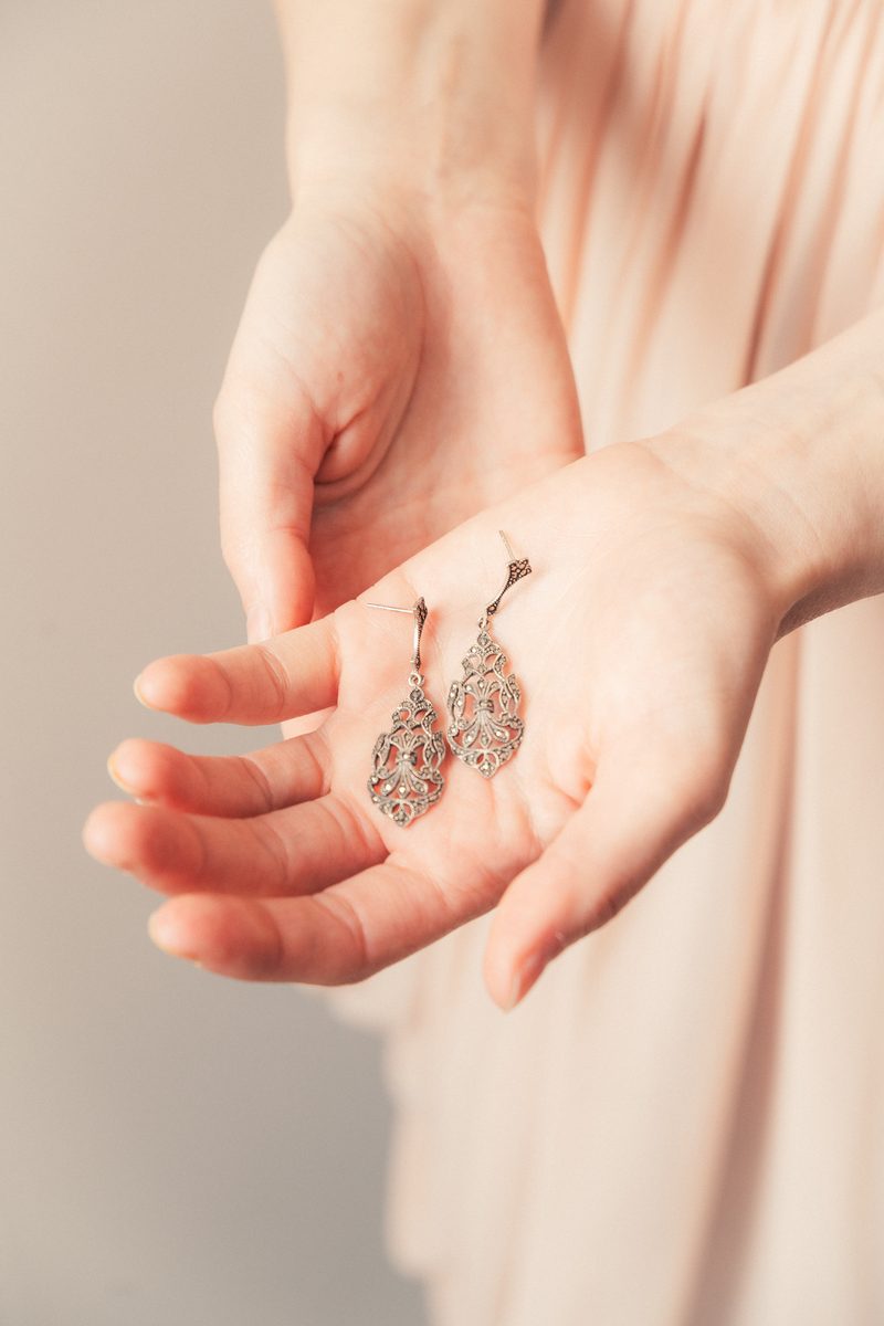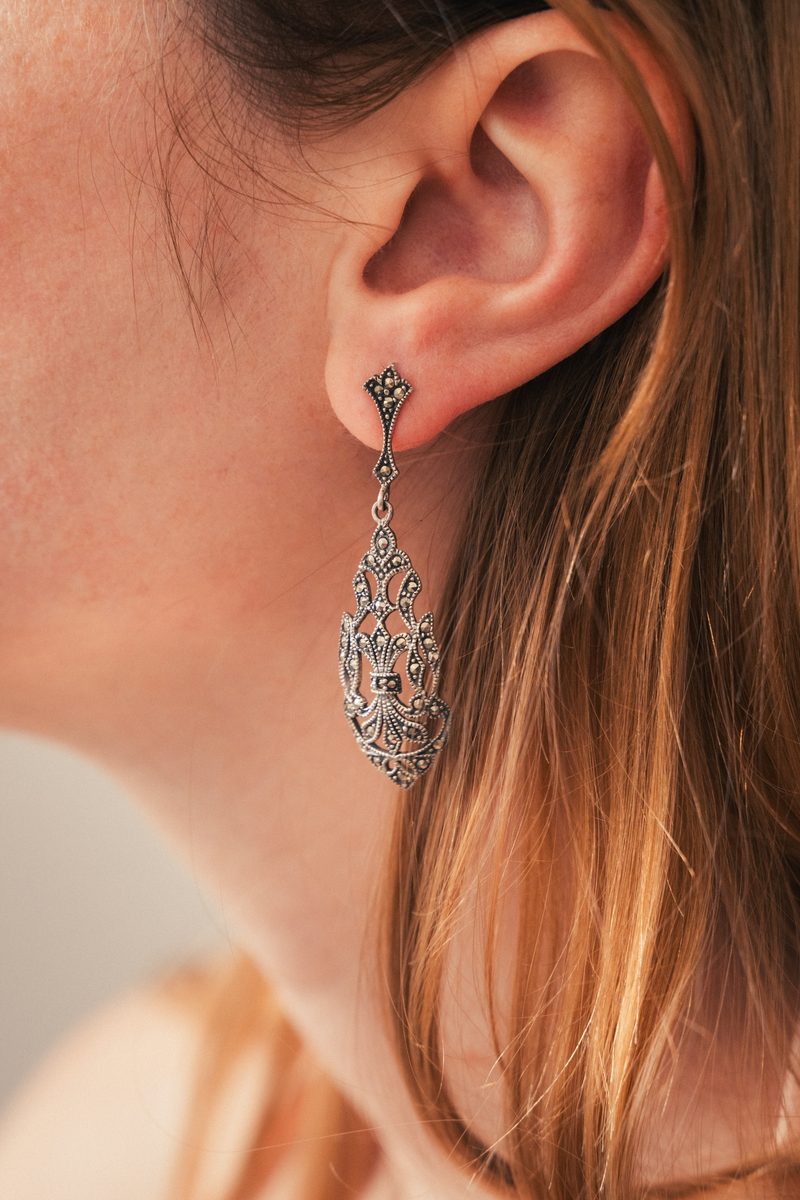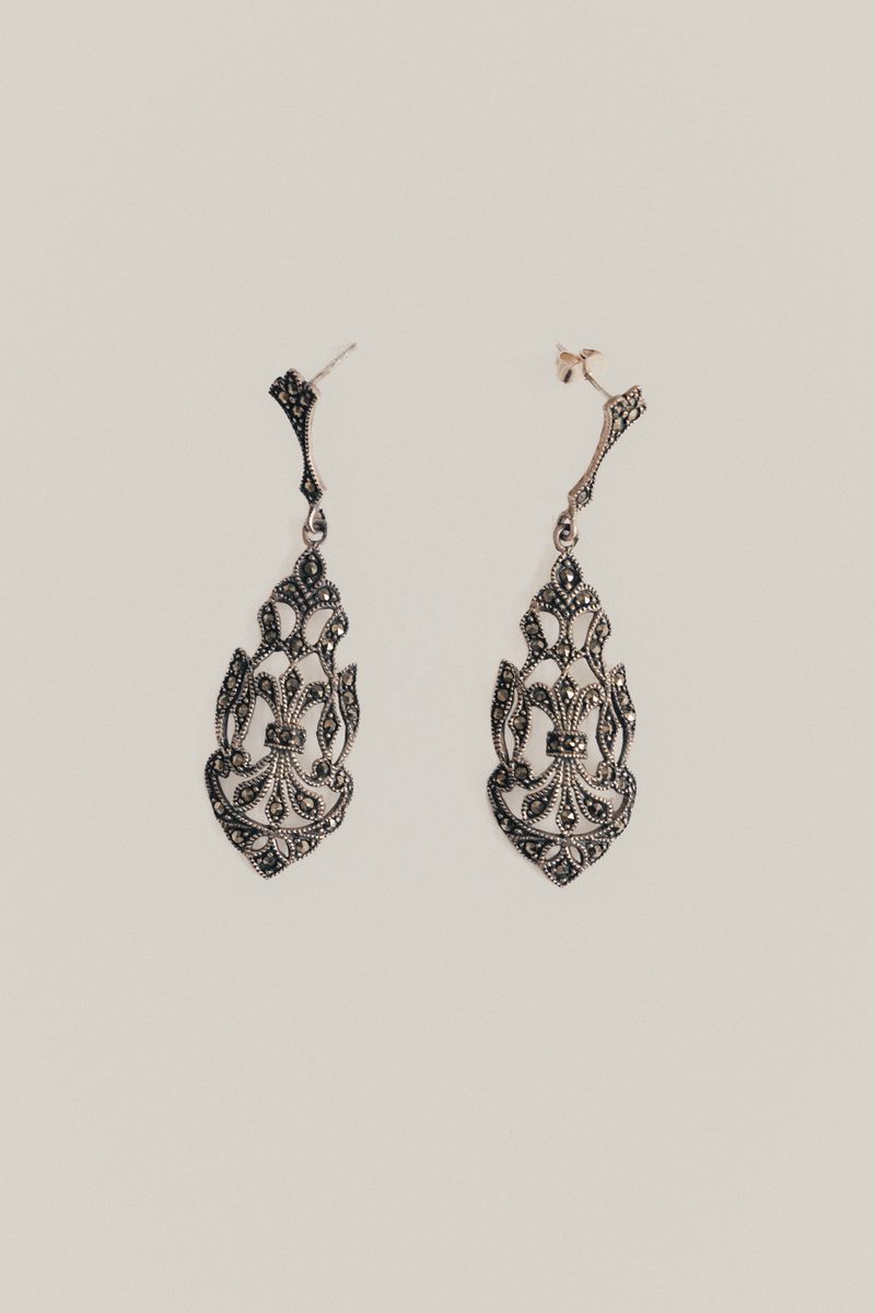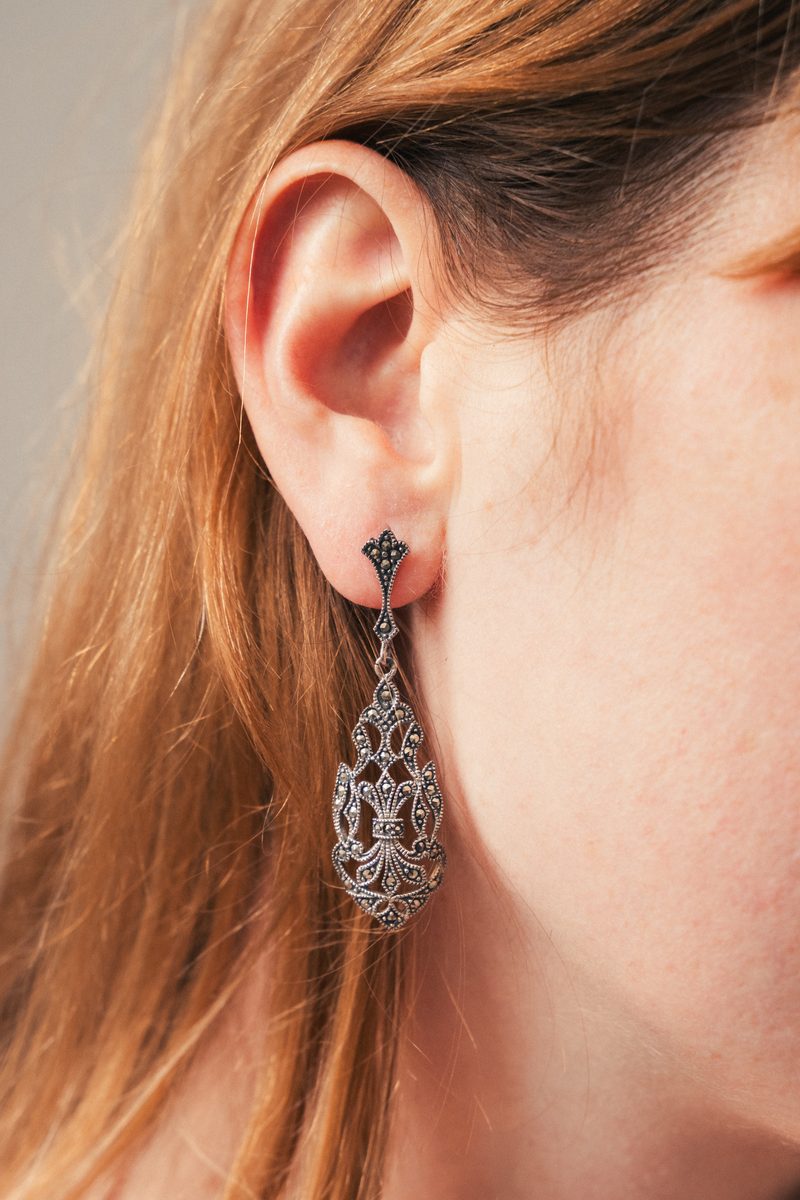 Pendientes colgantes de plata de ley con marquesitas, de inspiración barroca. El cuerpo de la pieza es una lágrima calada con motivos vegetales y florales en relieve — un trabajo de orfebrería que combina volumen, movimiento y detalle con una ligereza sorprendente. Las marquesitas aparecen distribuidas en puntos estratégicos de la composición, aportando destellos oscuros y minerales que dialogan con la plata oxidada de la montura.