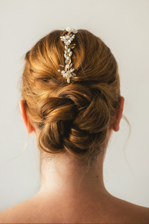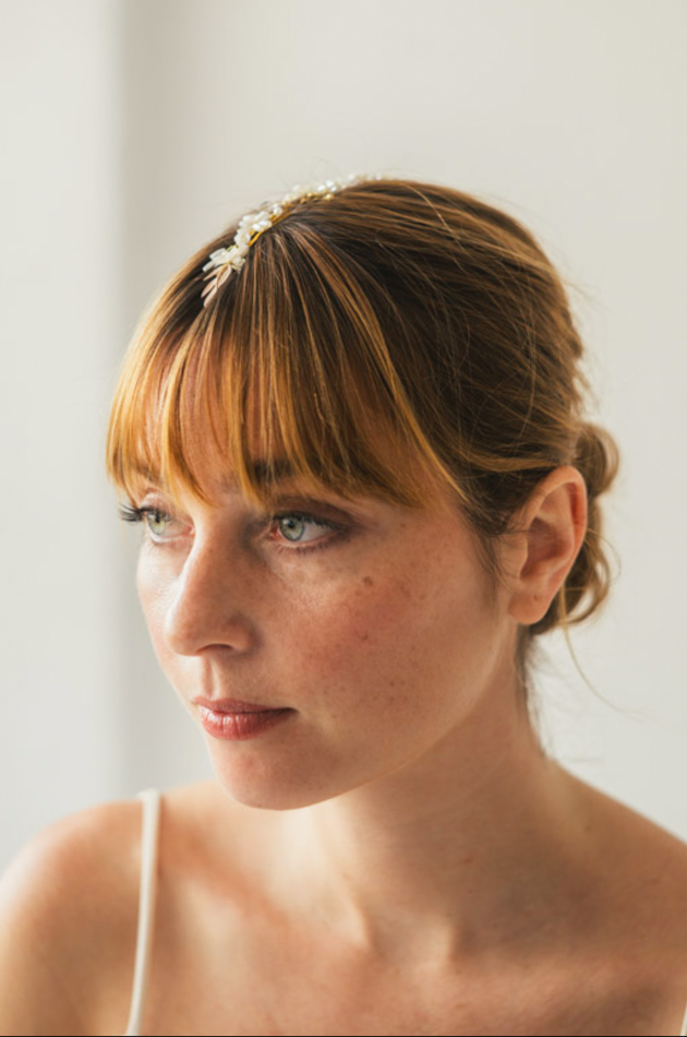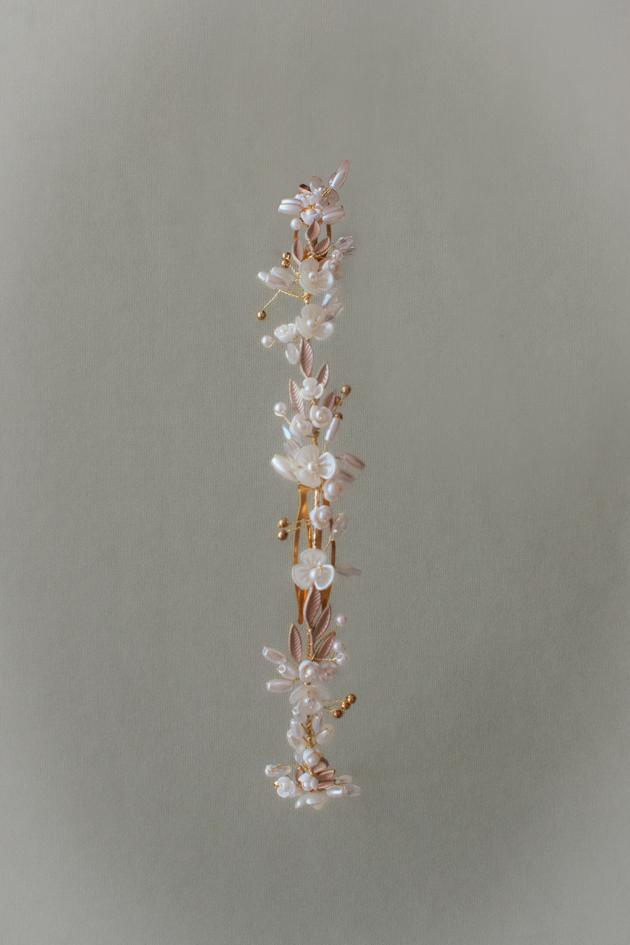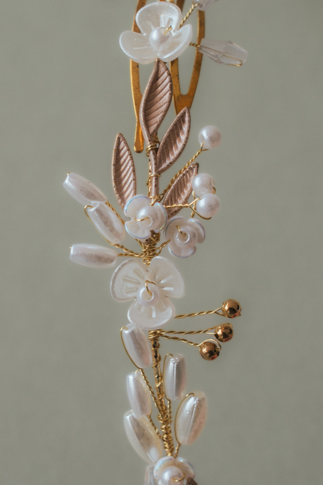 Tocado cubre raíz para novia en latón dorado hechas a mano con detalles de perlas, montadas sobre alambre dorado flexible. Ideal para recogidos, moños bajos o trenzas de estilo natural y romántico.