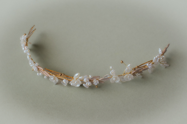 Tocado cubre raíz para novia estilo vintage en latón dorado con detalles de perla