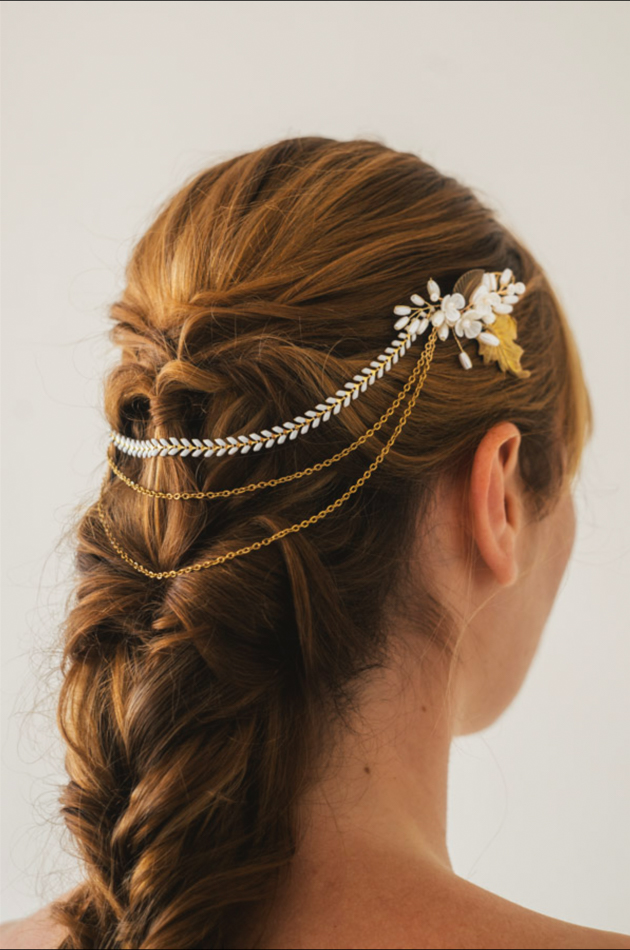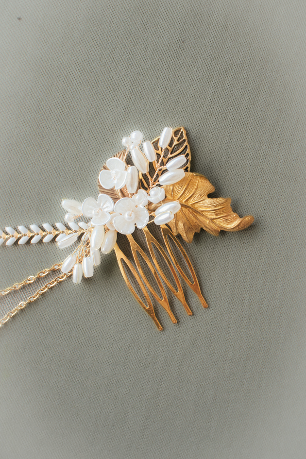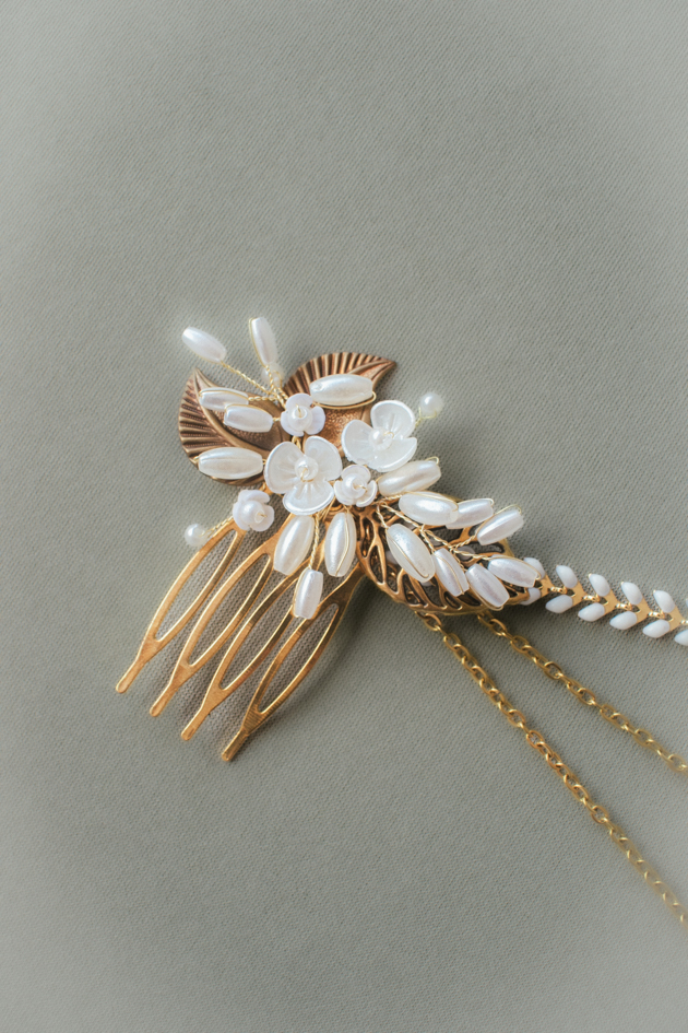 Tocado de latón dorado hecho a mano con detalles de perlas, montada sobre alambre dorado flexible y cadenas. Ideal para recogidos, moños bajos o trenzas de estilo natural y romántico.