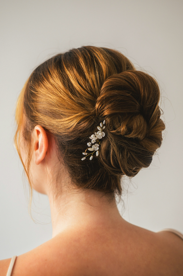 Tres horquillas pequeñas de latón dorado hechas a mano con detalles de perlas, montadas sobre alambre dorado flexible. Ideal para recogidos, moños bajos o trenzas de estilo natural y romántico.